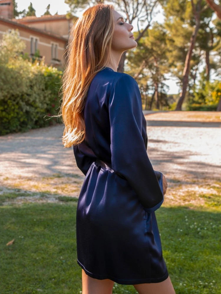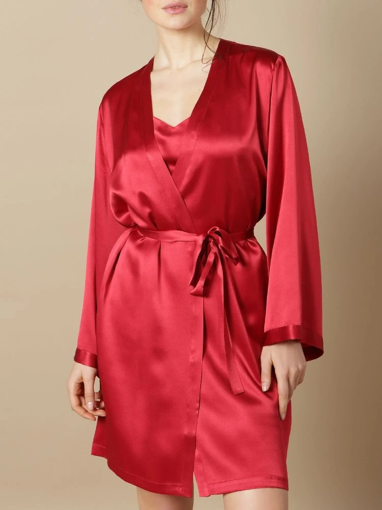 Der kurze Seiden-Morgenmantel Laser der französischen Edel-Marke Marjolaine ist aus feinem Seidensatin (100% Seide) gefertigt. Der hochwertig verarbeitete kurze Morgenmantel ist die perfekte Ergänzung zu den Seiden-Nachthemden und Negligés von Marjolaine.