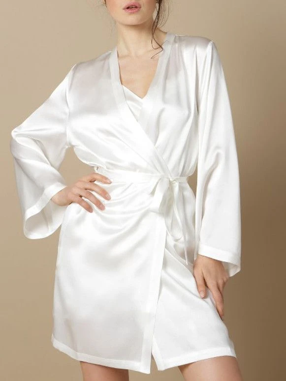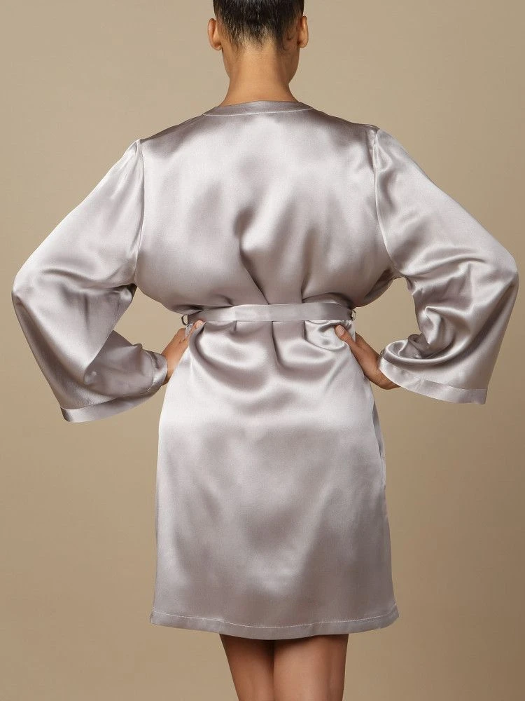 Der kurze Seidenmorgenmantel Laser hat lange Ärmel, ein schmales Revers und wird mit einem Bindegürtel geschlossen. Er ist aus der Basic Kollektion Soie Unie von Marjolaine und in Uni-Farben erhältlich.