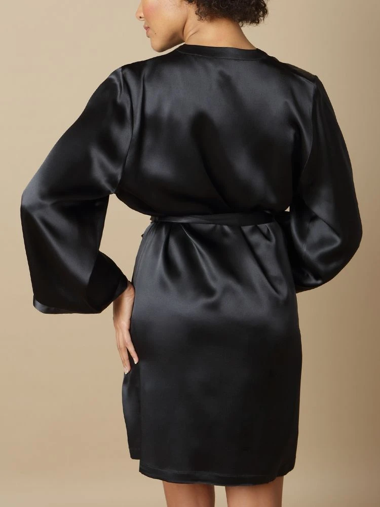 Dieser kurze Seiden-Morgenmantel ist ca. 90 cm lang. Er wird in den Größen 36 bis 46 angeboten (deutsche Damengrößen) und ist in den folgenden Farben erhältlich: