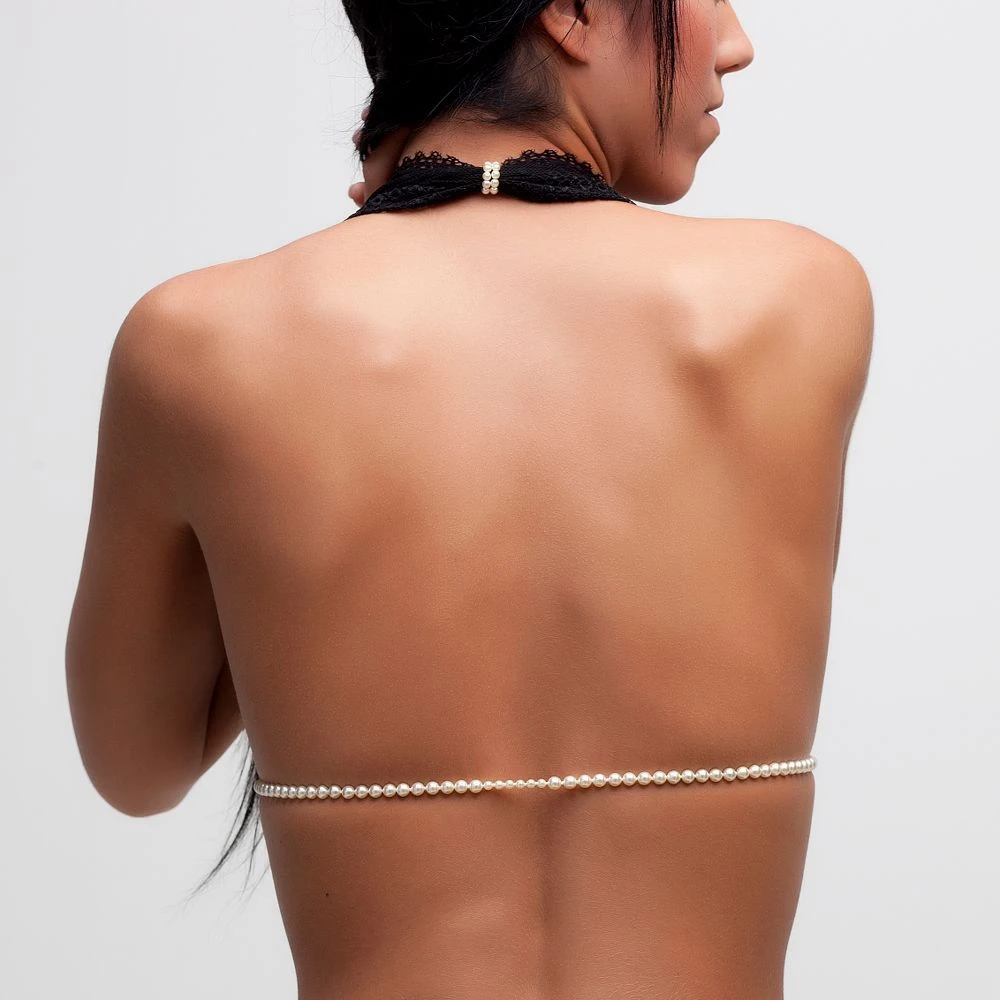 Der G-Bra aus der Serie Bracli&G ist aus zarter gepunkteter Spitze gefertigt. Die raffinierte Konstruktion dieses Büstenhalters ermöglicht zwei Varianten, diesen BH zu tragen. Der horizontale Träger besteht aus einer Kette aus den edlen Manacor – Perlen, der unterhalb der formbaren Cups durchgezogen werden kann, so dass die Manacor-Perlenkette entweder vorne oder hinten unterhalb der Brust mit einem Band zusammengebunden werden kann. Die Cups können individuell angepasst werden durch zwei Perlenringe, die sich am BH befinden. Mit Hilfe dieser Perlenringe können sowohl die Breite der Nackenträger als auch die Größe der Cups modifiziert werden, so dass sich der G-Bra Ihren Körperkonturen anpasst.
