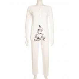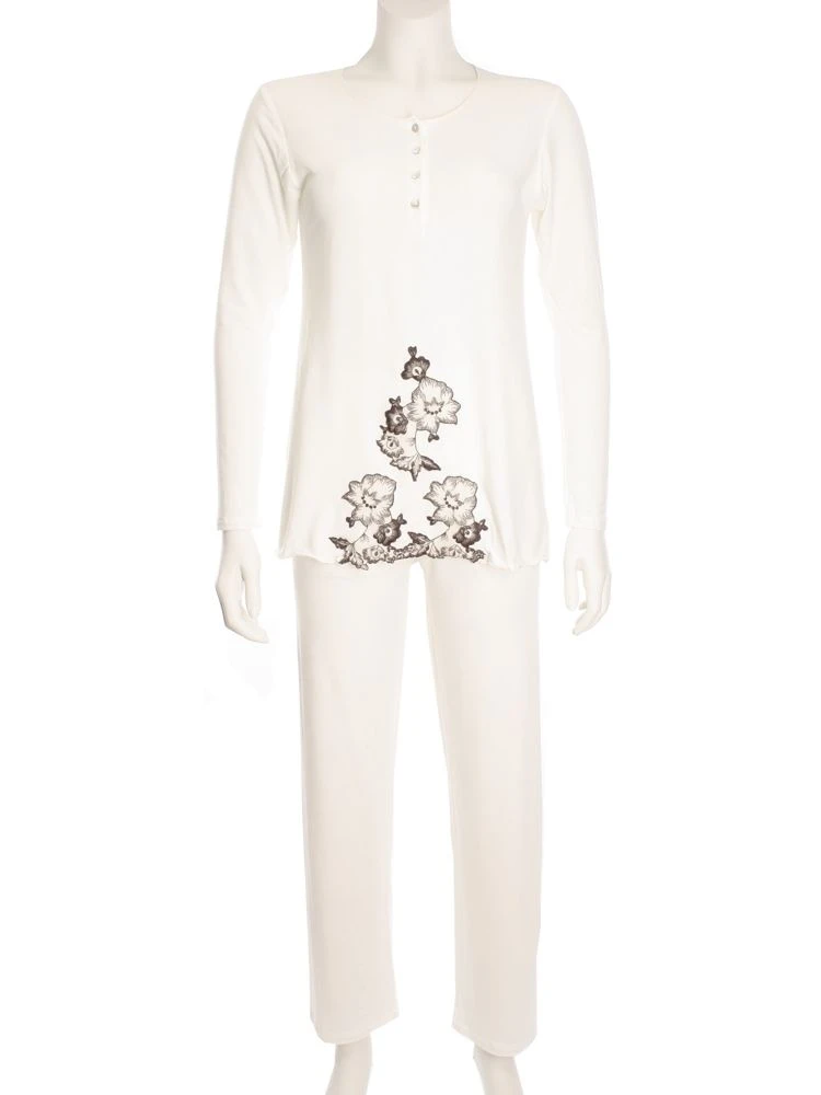 Der Pyjama Tamika ist in der Farbe elfenbein-weiß mit ebenholz-braun und in den Größen 36 bis 44 erhältlich (Herstellergrößen S bis XXL).